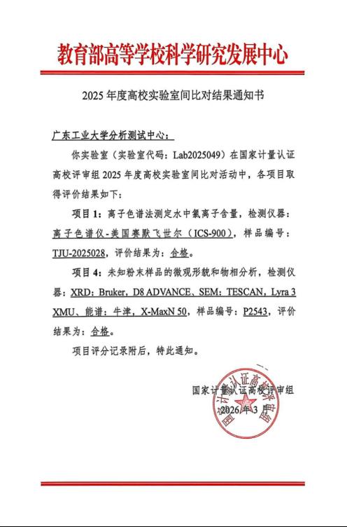 近日,教育部高等学校科学研究发展中心正式公布《2025年度高校实验室间比对结果通知书》,我校分析测试中心参与的两项比对项目全部一次性通过!