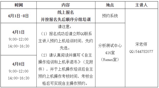 为更好的满足广大师生的测试需求,分析测试中心光谱分析室将于4月组织举办显微共焦拉曼光谱仪上机操作培训。具体安排如下: